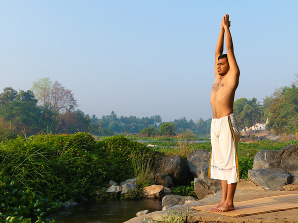 Stand straight, with your feet together; inhale, lift both your arms upwards, as far as you can. Now exhale, bring your arms together in front of your chest in a prayer pose.