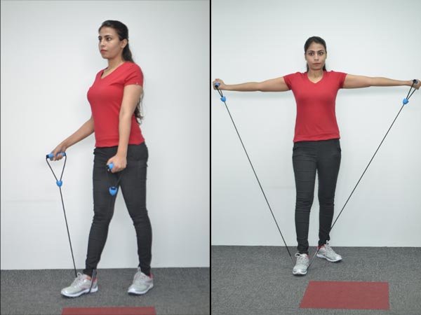 This isolation move is known to build the bolder shoulders and will tone your upper body perfectly. Stand with one foot positioned over the centre of the tube band. Grip each handle with the arms kept down at your side. Then, raise your arms slowly straight out to the side to the shoulder-level in a spread eagle position.