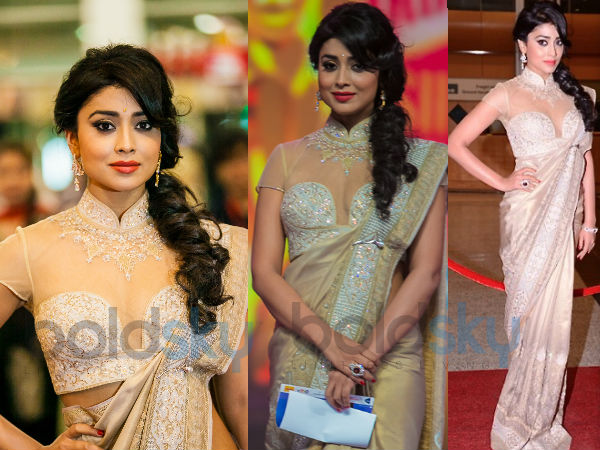 Shriya Saran wore an off-white coloured saree from Tarun Tahiliani at SIIMA 2013. The saree was draped over a closed neck blouse made of lace and embellishments.