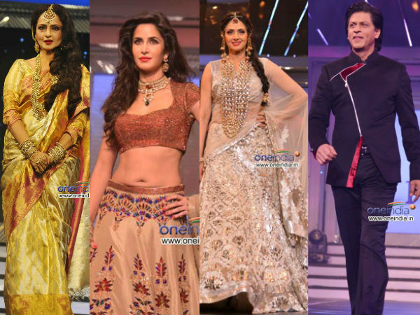 Shahrukh Khan, Katrina Kaif, Anushka Sharma, Madhuri Dixit, Preity Zinta, Rekha, Parineeti Chopra, Juhi Chawla, Sridevi etc were seen gracing the ramp. They all were decked up in traditional outfits and looked gorgeous and handsome. While Rekha stuck to her Kanjeevaram, Perita Zinta wore a sharara, Katrina Kaif wore a lehenga, Anushka Sharma wore a black saree and carried the retro look.