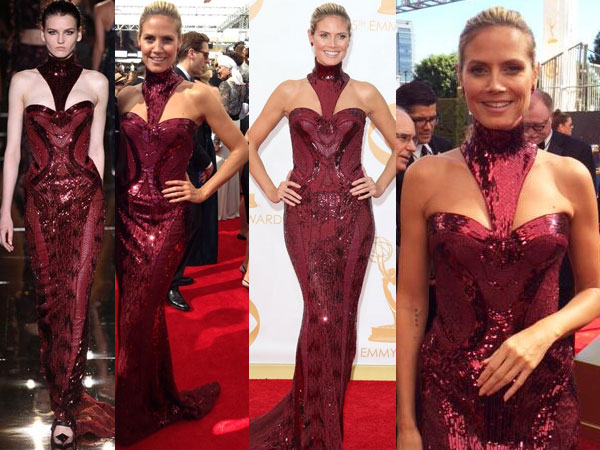 Heidi Klum's Atelier Versace gown at Emmys 2013 red carpet was one of the best dresses seen this year. The red carpet look was completed with princess ponytail which looked perfect with this sparkling Atelier Versace gown.