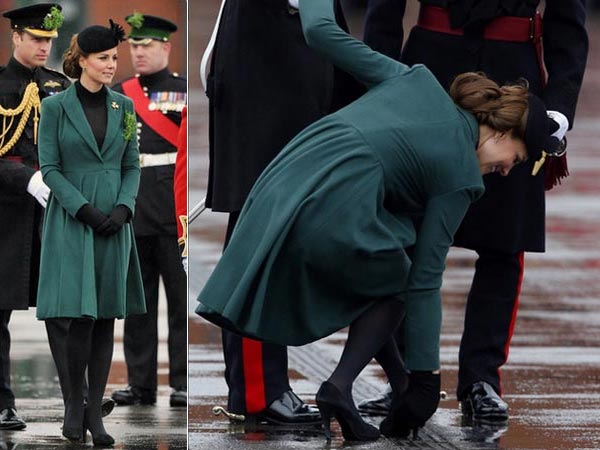 Kate finished her chic and fashionable look with a beret. Although pregnant Kate seems to wear high heels comfortably during her pregnancy, she suffered a heel mishap at the St. Patrick's Parade, Aldershot Barracks in England. The 31-year-old Duchess of Cambridge's heel got stuck in a grate and the royal Kate suffered a heel mishap. Kate boldly took out the heel and continued with her duties at the event.
