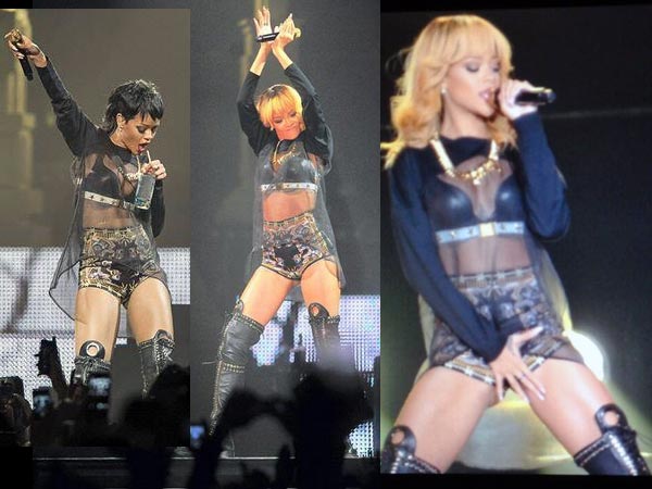 Rihanna arrived around 40 minutes late on the stage and was seen wearing a black sheer mullet patterned dress which showed off her black leather bikini bra underneath. She wore her favourite knee length black studded spike boots which covered her lean legs. Hardly after two minutes on the stage, Rihanna started touching and rubbing her crotch which looked embarrassing on the stage.