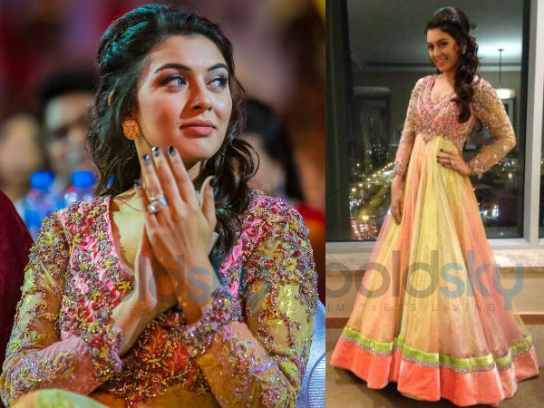 However, Hansika turned heads around when she walked the SIIMA 2013 red carpet on Day 2. Hansika wore a gorgeous anarkali gown from the same designer Pawan & Pranav. The multi-coloured silhouette had intricate hues of pink on it. The main colours of the Pawan & Pranav silhouette were mustard yellow, peach and light green.