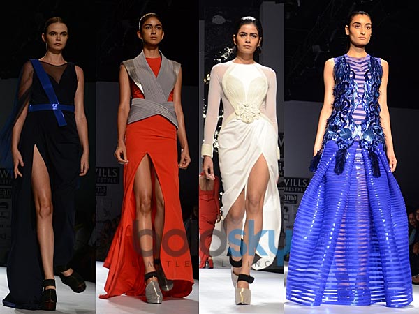 Multi-layers, cut out backs, sheer outfits and shimmering pencil skirts were seen in Amit Aggarwal's collection at WIFW 2014 ramp. We saw a lot of thigh high slit gowns in different colours like silver, coral, black, orange and blue. Sheer bodice and full sleeves flowing gowns looked elegant for a red carpet look.