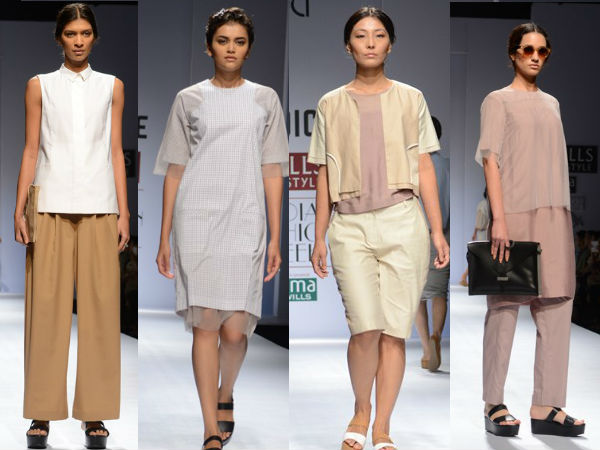 Bodice by Ruchika Sachdev had light colours in checkered prints which looked simple. Her spring summer collection at WIFW 2014 featured loose knee length frocks, trousers, jackets, skirts, capris, kurtas and crop tops. Only some of her outfits had light small checks on it which were hardly visible. Otherwise, the collection was plain in light colours.