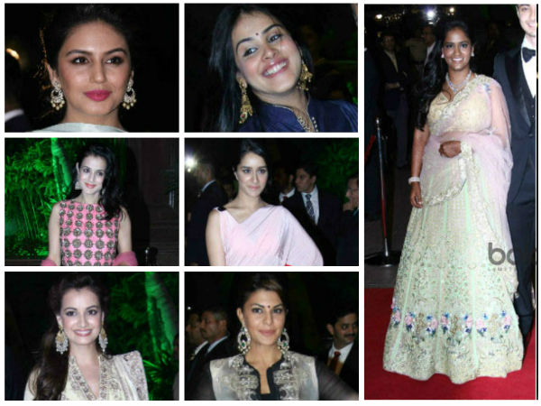 At the wedding reception of Arpita Khan's, we got sight of Sonakshi Sinha in a red stunning gown. The beautiful Huma Qureshi was there too and she looked perfect in a heavy cream ghagra. Amidst these lovelies, newly married Dia Mirza too was seen looking as angelic as ever.