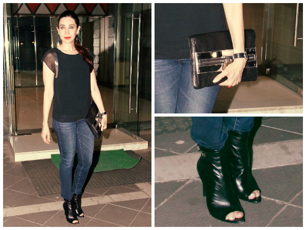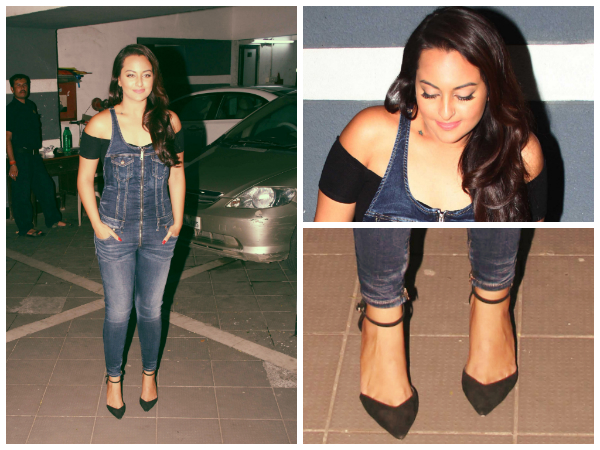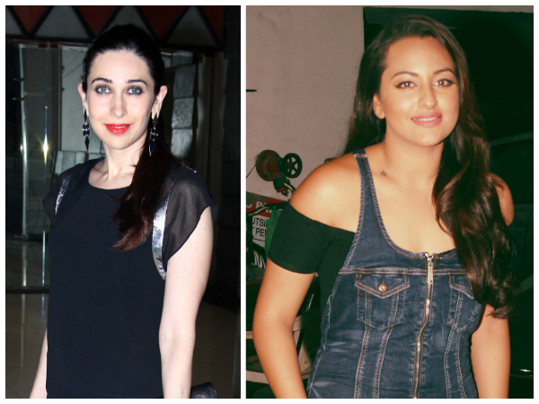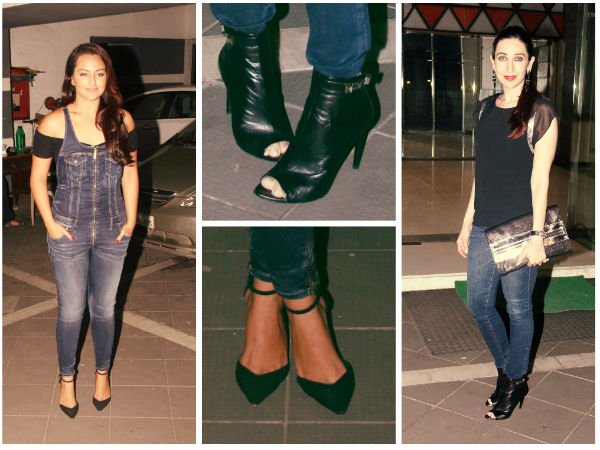Sonakshi Sinha wore a different denim look compared to Karisma's. Ms Sinha wore a black off-shoulder top, dark blue dungarees and black pointed flats. Karisma Kapoor's denim look was classy! The beautiful mum wore a silver paneled black top and tight blue jeans.