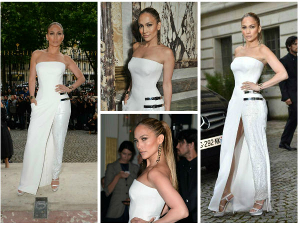 The hybrid outfit was strapless and had a metallic obe belt on it. JLo wore her hair high in a neat ponytail making this look even more effective. She accessorized the outfit with a pair of drop down earrings in the pattern of a chain. The earrings set off the look in a brilliant way. She also wore white coloured block high heels with this ensemble that were a perfect match.