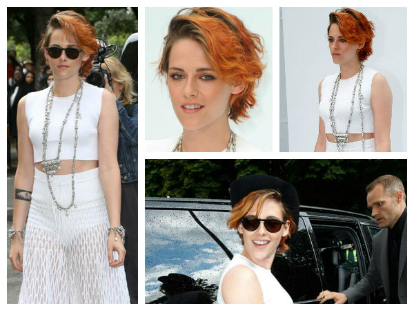 Last year at the Paris Fashion Week, Kristen Stewart was spotted in a white tuxedo and black shorts from Chanel. She had brown hair then and had sported a wet look with a neatly tied up ponytail.