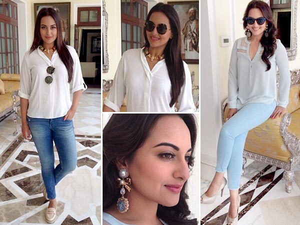 The diva looked stunning in jeans and shirt. Sonakshi Sinha, who rarely wears causals, looked lovely in shades of white and blue.