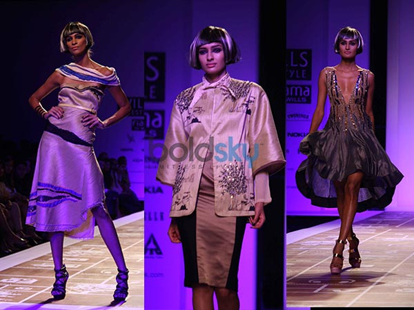 Day 1 of the Wills India Fashion Week Autumn Winter 2014 was wrapped up by Rina Dhaka. She blended fashion and technology beautifully which created a magic on the runway. Rina Dhaka primarily focused on black and white colours. Dressed in monochrome prints, hand sewn appliques and cherry blossoms, models showcased the metallic shimmer and glitter on the ramp. Silk skirts, crop tops, colourful striped prints, sheer blouses and flowy designs looked nice.