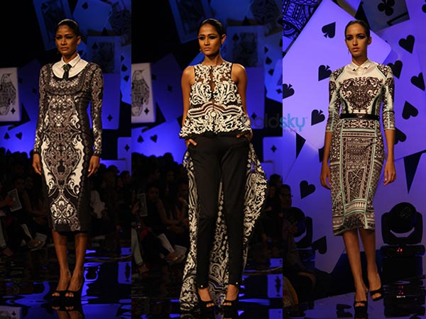In their new and trendy collection, what you will get to see is the four patterns of the deck of cards being used beautifully on their attires. Spades, diamonds, hearts and clubs descend into a realm of fashion in the eyes of Pankaj & Nidhi at the Wills India Fashion Week 2014. The crafted prints and the dexterous embroidery which is seen on each of their masterpieces is something that will keep you gazed for hours.