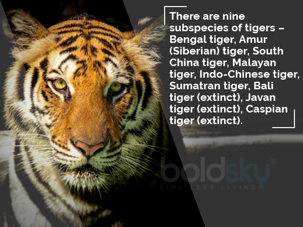There are nine subspecies of tigers - Bengal tiger, Amur (Siberian) tiger, South China tiger, Malayan tiger, Indo-Chinese tiger, Sumatran tiger, Bali tiger (extinct), Javan tiger (extinct), Caspian tiger (extinct).