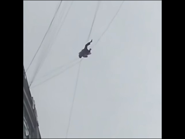 The video shows the man dangling from a telephone wire high-up, outside his hotel, and it has gone viral, as one can see the man trying to escape from one building to another.