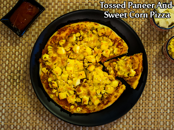 Tossed paneer and sweet corn pizza is prepared by making the dough and baking it as well. The pizza sauce is made from tomato puree sauteed with other ingredients.