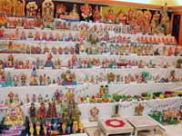 The traditional arrangement during Bommai Kolu during Navratri involve nine steps for the nine divine nights. The first three sets of steps are reserved for (dolls display) of Gods and Goddesses. (dolls display) Dolls of Gurus and saints occupy the second three set of steps. On the last three steps are displayed dolls representing the Hindu tradition and lifestyle like marriage, temples, farming, traditional women etc. Dolls display of animals, birds and other species also find place in the last three steps.